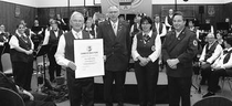 Auch Ehrungen für lange Mitgliedschaft fanden einen gebührenden Platz im Programm und so konnte Vorsitzender Günter Wingens Birgit Behle-Frings für zehnjährige Mitgliedschaft mit der bronzenen und den Orchesterdirigenten Willi Beckers für 30-jährige Mitgliedschaft mit der goldenen Vereinsnadel auszeichnen. Mit einem Ehrendiplom für 60-jährige Mitgliedschaft sprach er Jacob Rumpen den Dank des Vereins aus – unter Würdigung seiner Verdienste in 40 Jahren ununterbrochener Vereinsführung als Vorsitzender und überdies schon in 45 Jahren als Geschäftsführer des Vereins. Vor zwölf Jahren hatte ihn der Verein bereits zum Ehrenvorsitzenden ernannt.